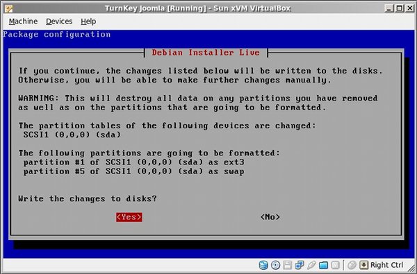 This boots TurnKey Joomla straight into the appliance's installer. Select the default "Guided" partitioning method, which figures out how to partition the virtual hard disk automatically. If unsure, just confirm the defaults.